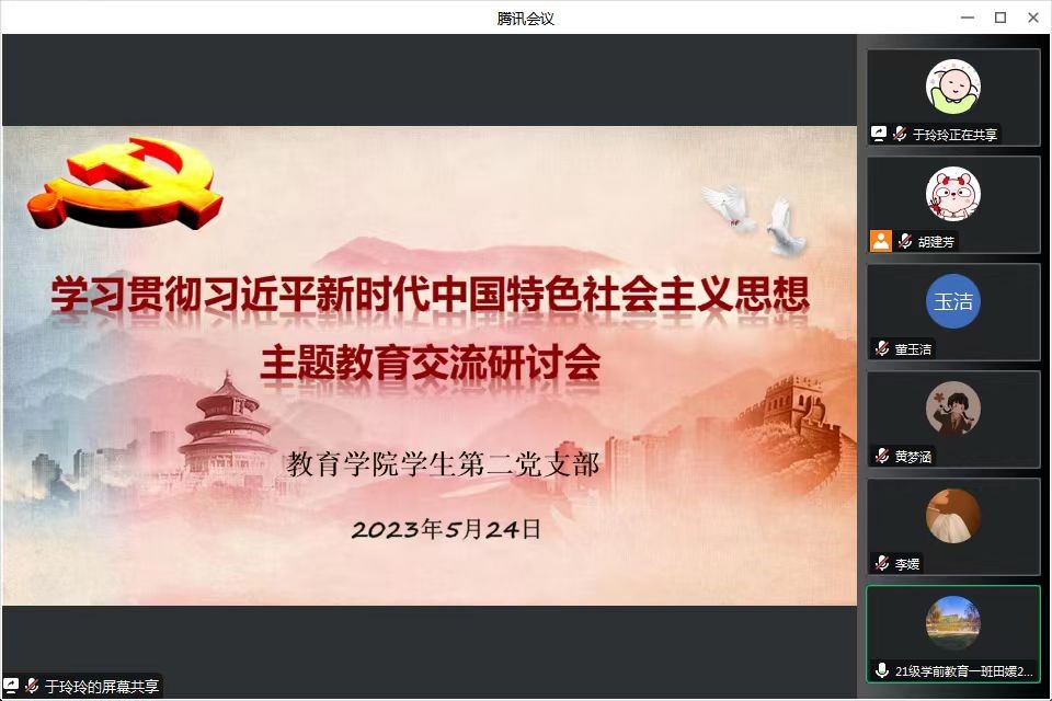 为进一步落实学习贯彻习近平新时代中国特色社会主义思想主题教育,5月24日晚,教育学院学生第二党支部在线上召开主题教育交流研讨会,会议由支部书记胡建芳主持,全体党员同志参加会议。