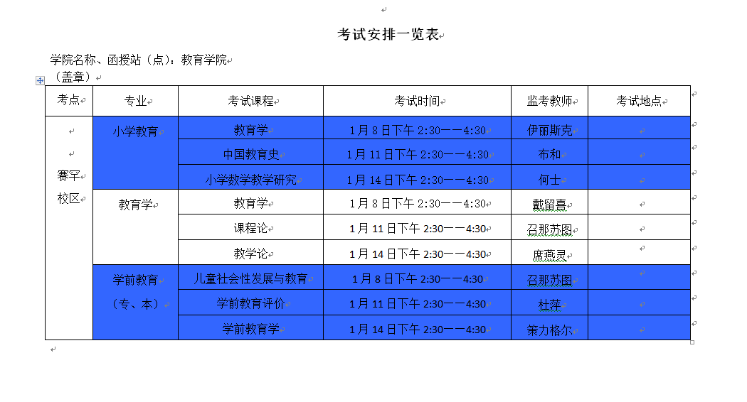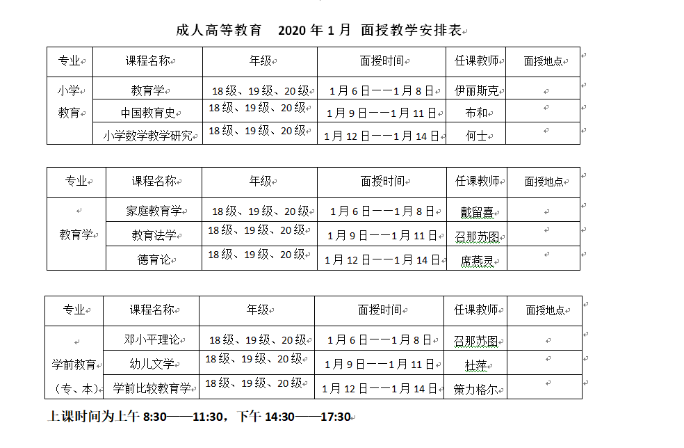 成人高等教育 2020年1月 面授教学安排表
