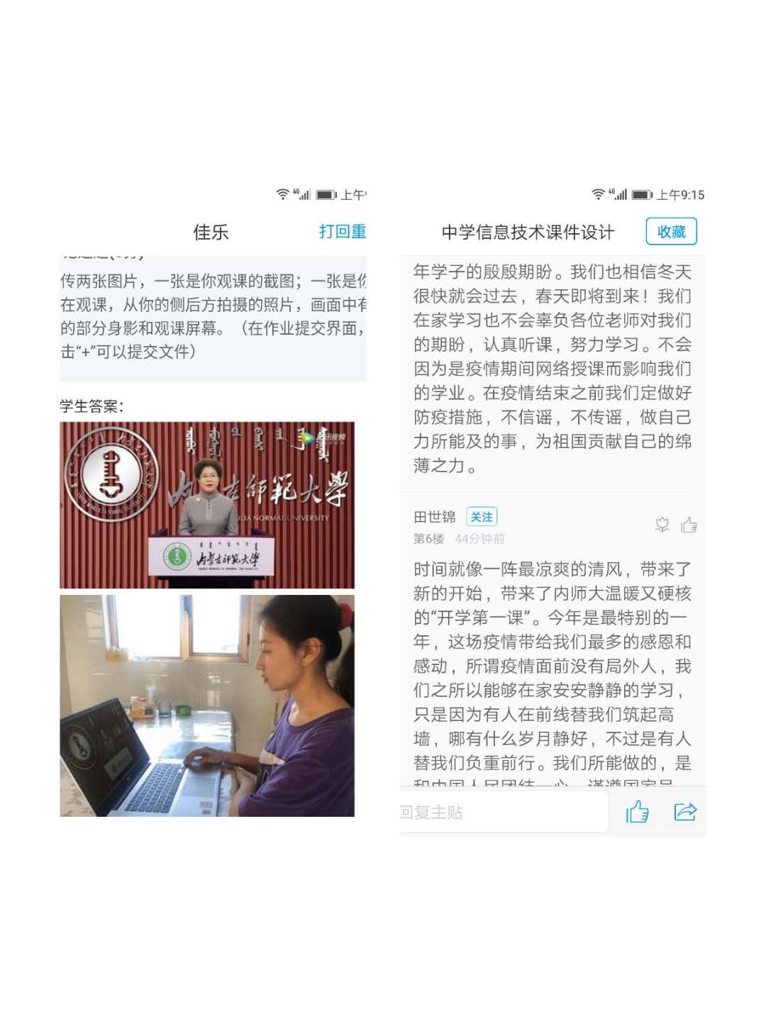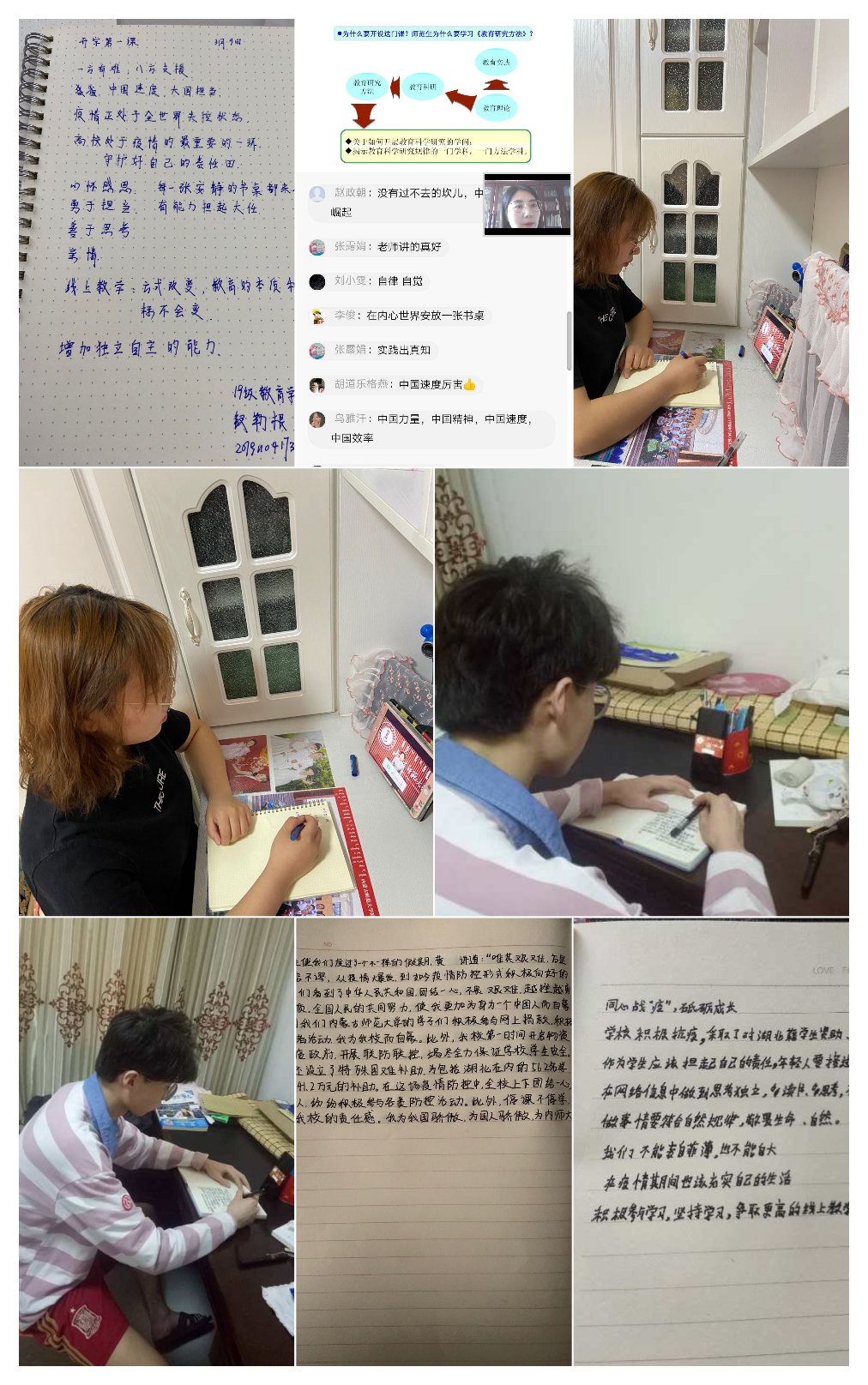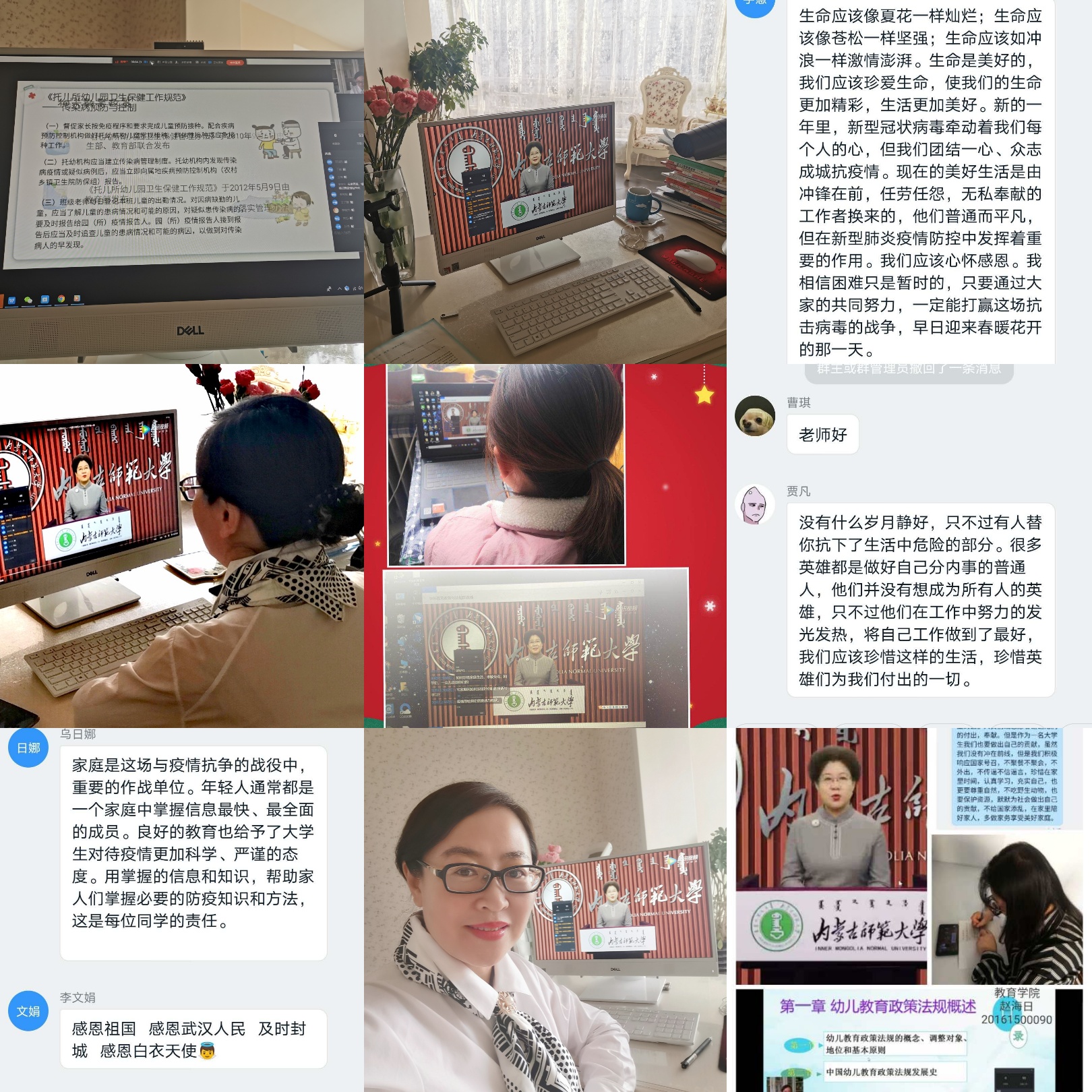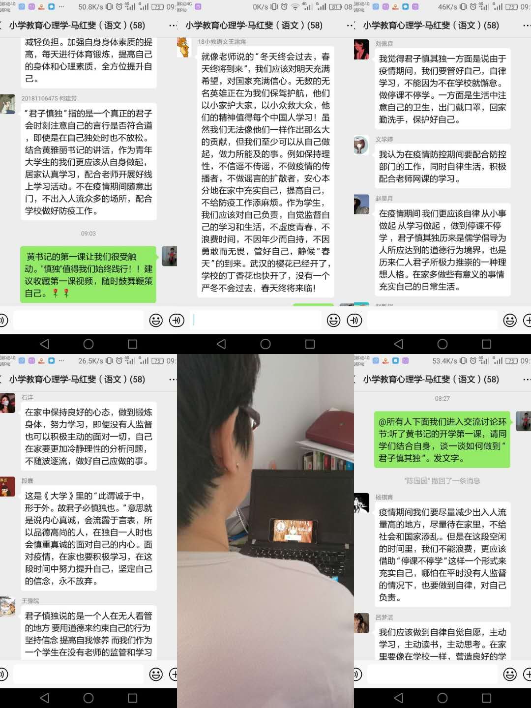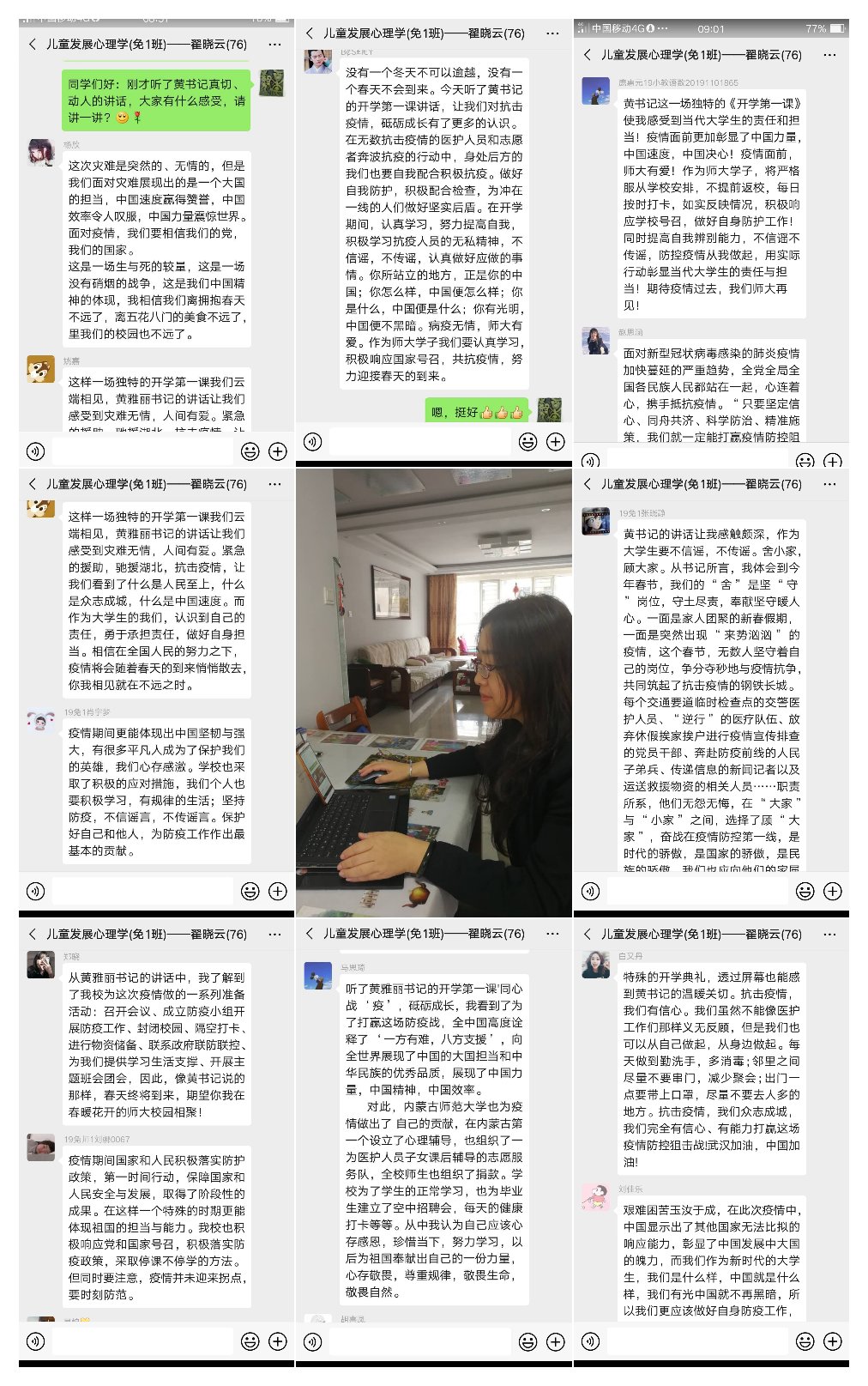 依据我院本科生在线教学工作开学安排,17级教育技术学汉班、19级小学教育免师一班、19级小学教育语文班、18级教育技术学蒙班、18级小学教育语文班、19级教育学类二班、19级教育技术学班、19级教育学类一班、18级学前教育班(合作教学)共九个班级在任课教师带领下提前上课并关注直播平台,准时一同认真学习黄雅丽书记讲授的《开学第一课》后,师生进行互动,任课教师就黄书记讲话中中国人民在疫情防控中展现出的中国力量、展现的责任大国形象开展思政教育,就黄书记对师大青年学子的殷殷寄语与同学们进行研讨,并将开展情况反馈至我院教务办。
