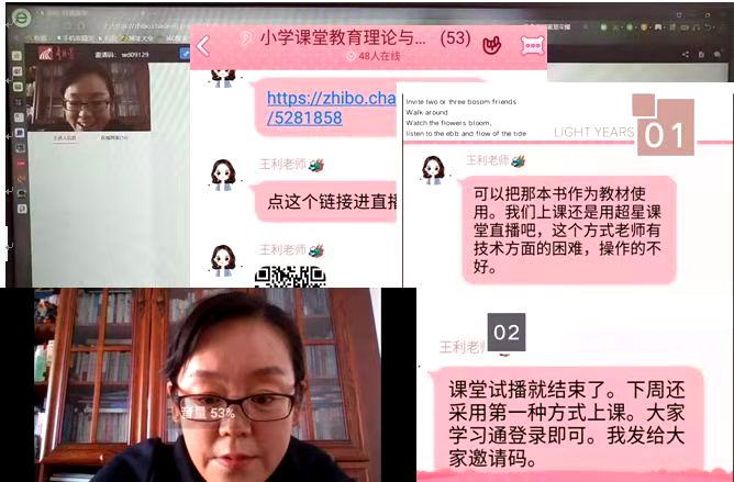 在进行网络学习时,我认为在上课之前,同学们应做好充足的准备,比如首先确保在良好的网络环境下进行学习,提前查阅老师发布的课件资料及相关教材,准时参加网课,并且准备好各科的笔记本,做好学习记录,出现问题一定要及时向老师反应,仍有疑惑的地方可在线上与老师一对一进行解答。总之,我觉得,任何事情都是把双刃剑。无论网课有着怎样的不足、弊端,想踏踏实实学习,想把未来紧紧抓在自己手心里的人,一定会有所收获。接下来我们来欣赏一下美丽动人的王利老师的在线教学照片叭~