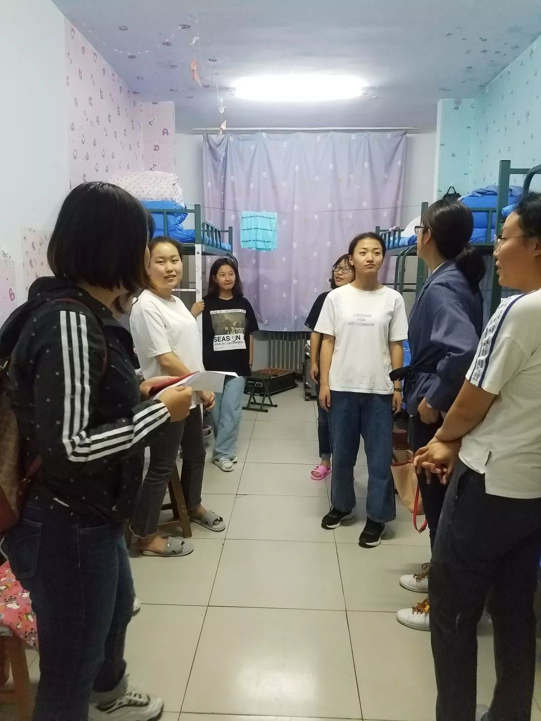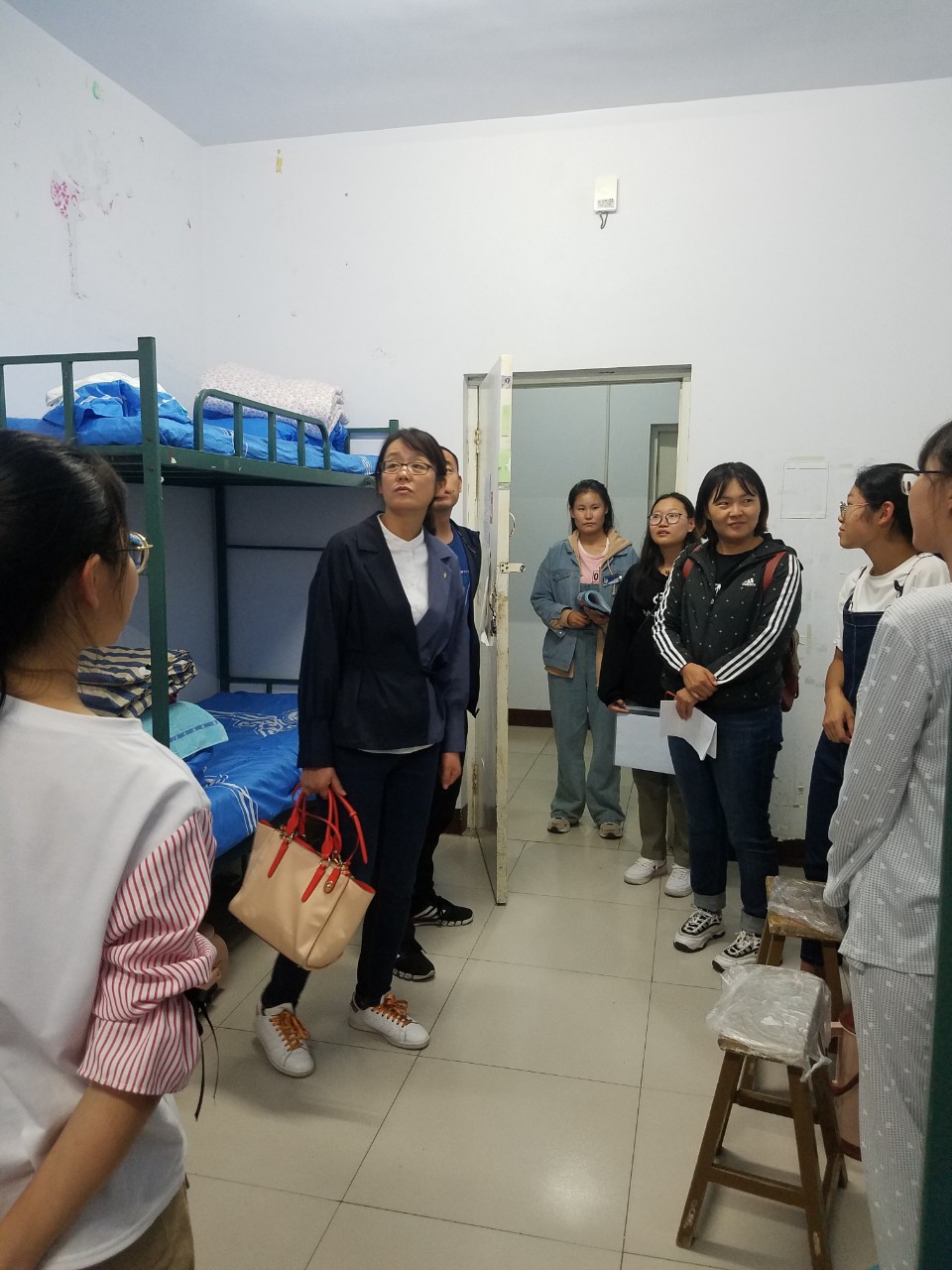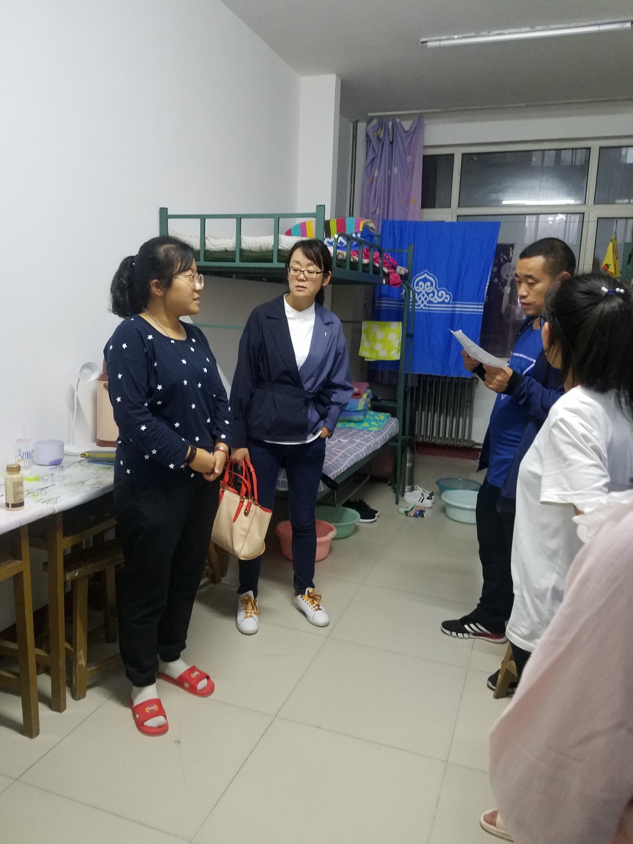 我院党委副书记兼副院长王利教授,学工办于国佳老师、团总支孙悦老师、辅导员张玉老师、苏日娜老师以及部分学生干部走进新生宿舍。