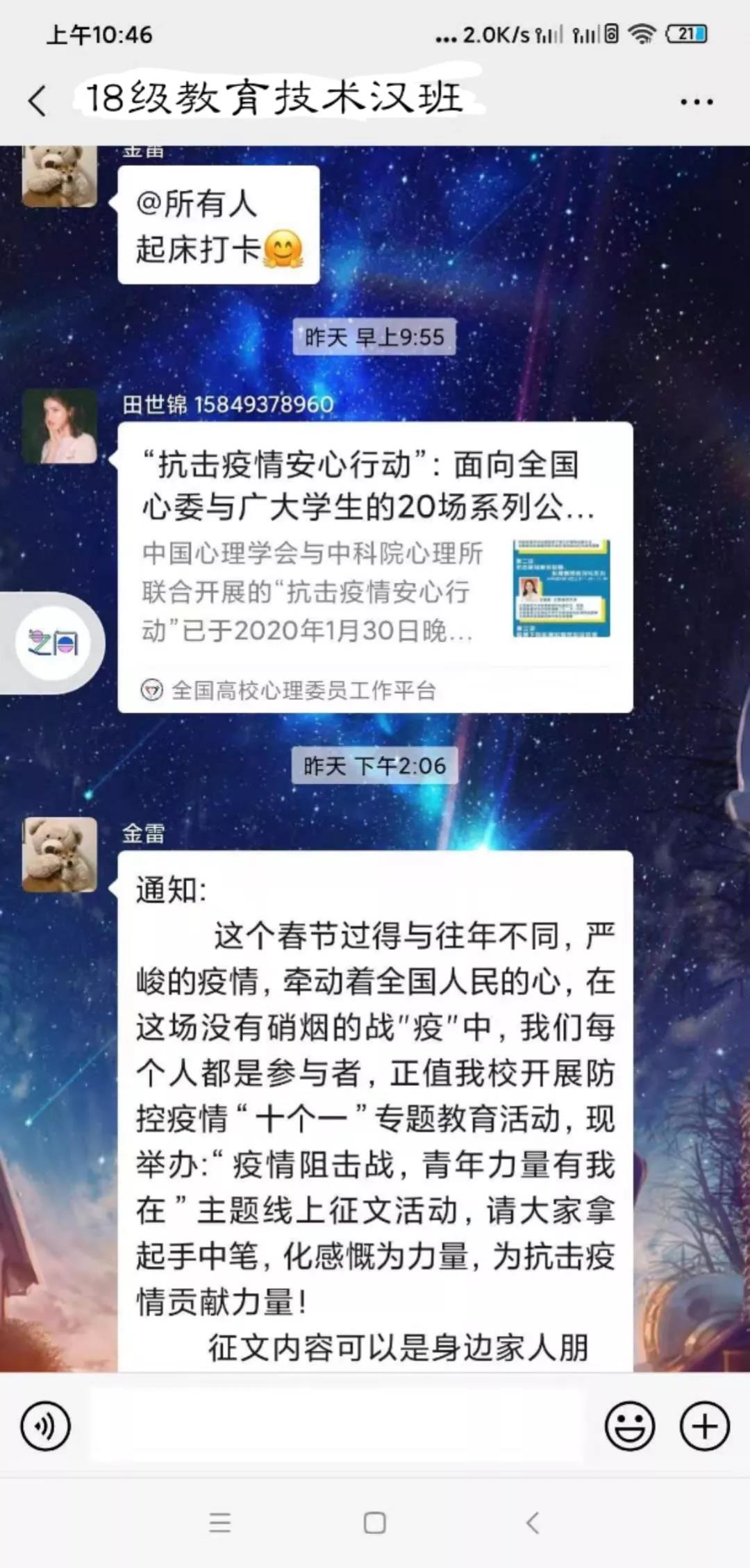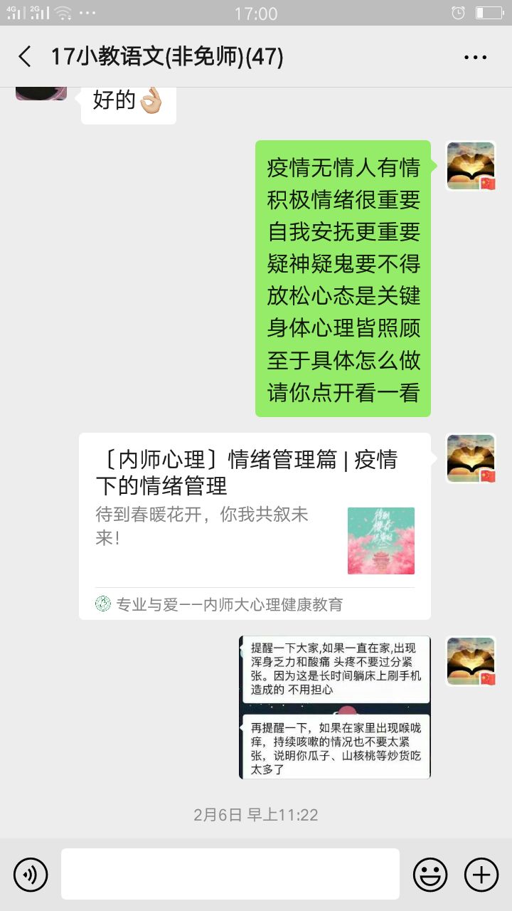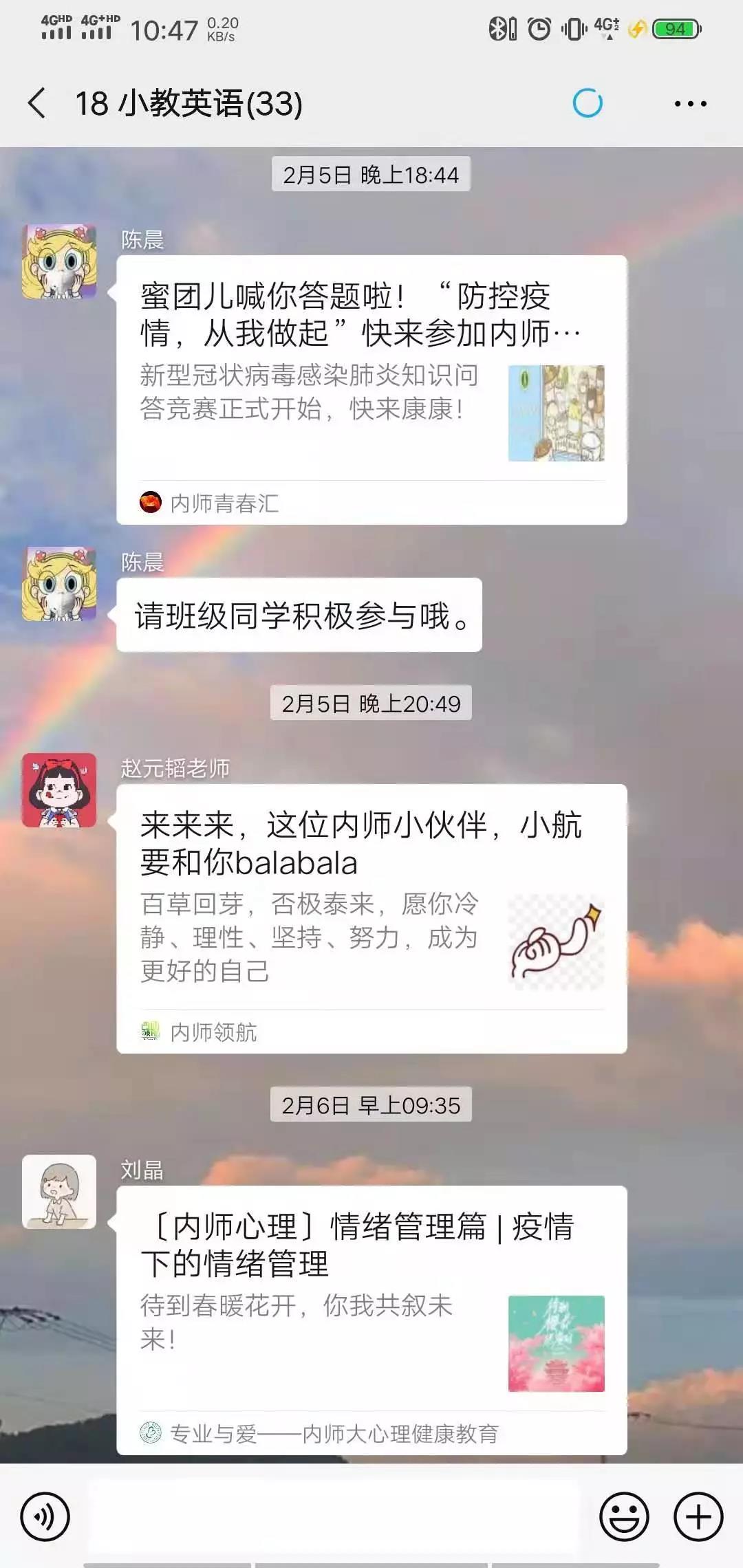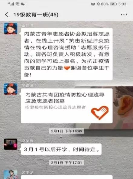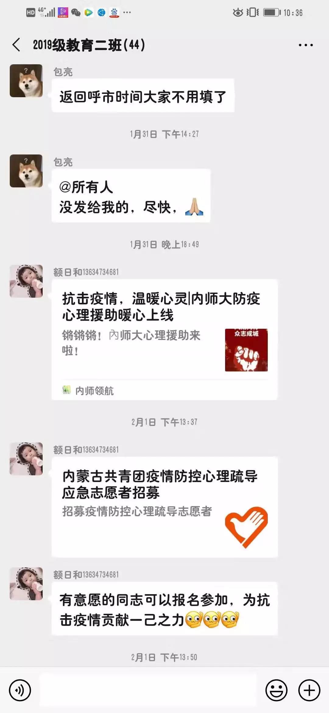 在这共克时艰的特殊时期,教育学院各班心理委员牢记自己的责任和使命,密切关注同学们的心理动态,积极对同学们进行心理辅导,转发心理疏导的相关文章,极大地缓解了同学们焦虑不安的心情。