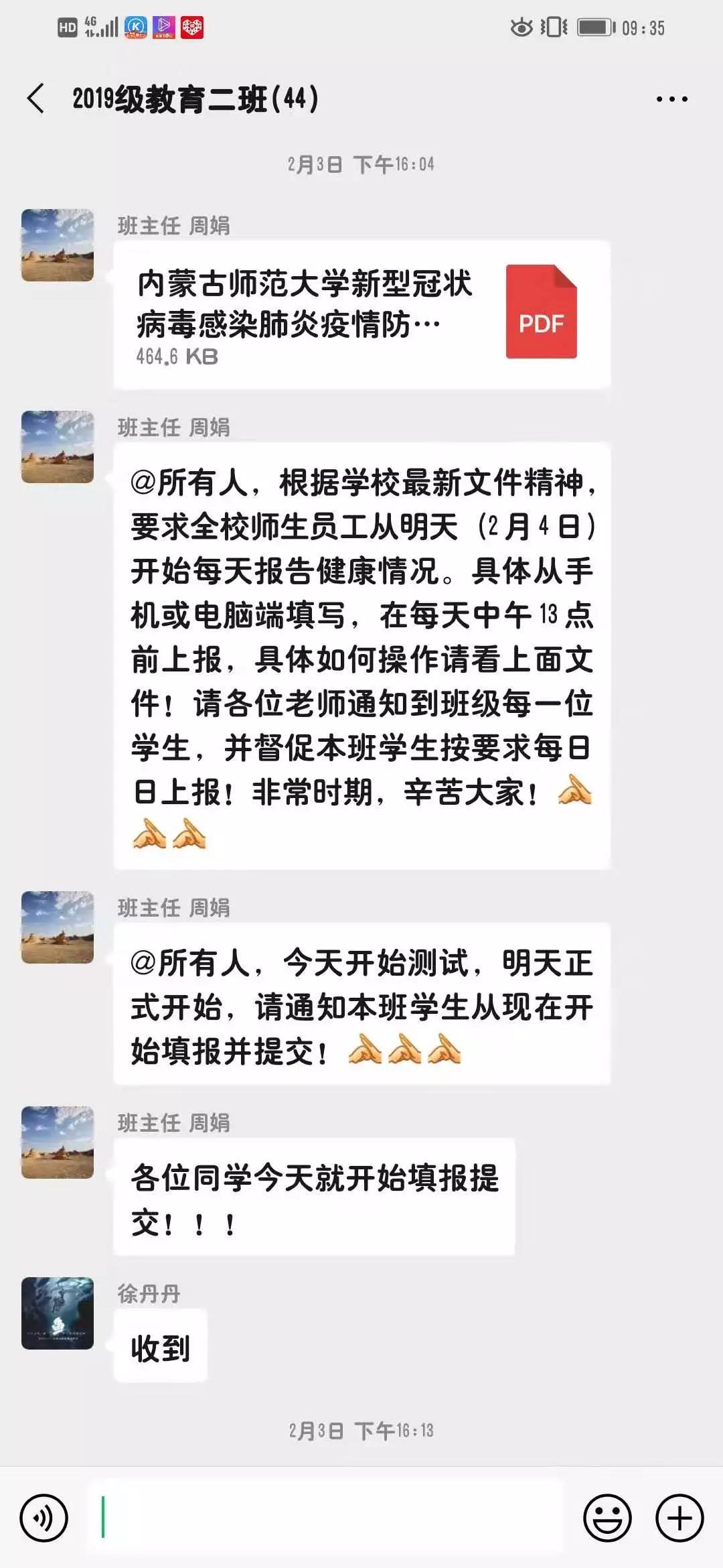 2020年在一场战“疫”中拉开帷幕,武汉成了全国乃至全球人最关注的一座城市,抗击疫情,刻不容缓。为贯彻落实自治区防疫最新要求和学校最新文件精神,切实做好防疫工作,教育学院认真执行“每日一报”打卡制度,全体师生按时填写提交“健康状况日报”,准确做好信息统计和信息上报工作,齐心协力防疫抗疫,以实际行动表明坚决打赢这场战争的决心,充分体现了我院对疫情防控工作的高度重视。