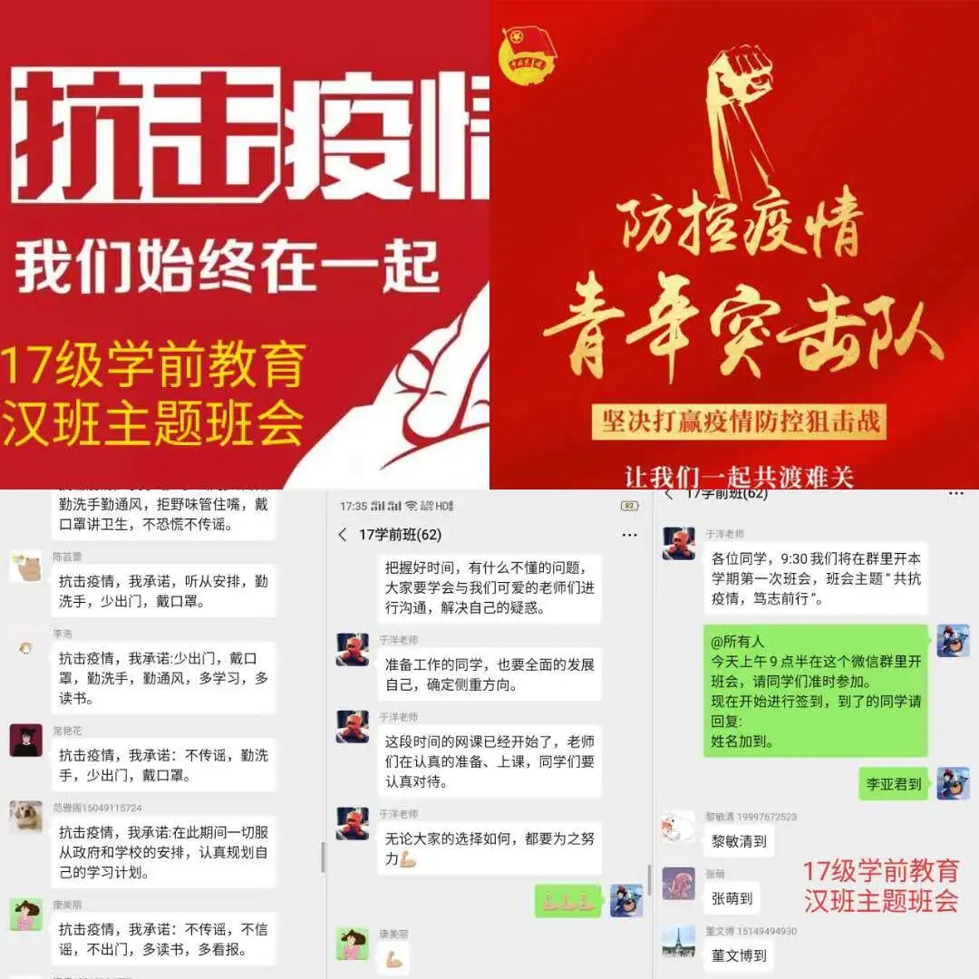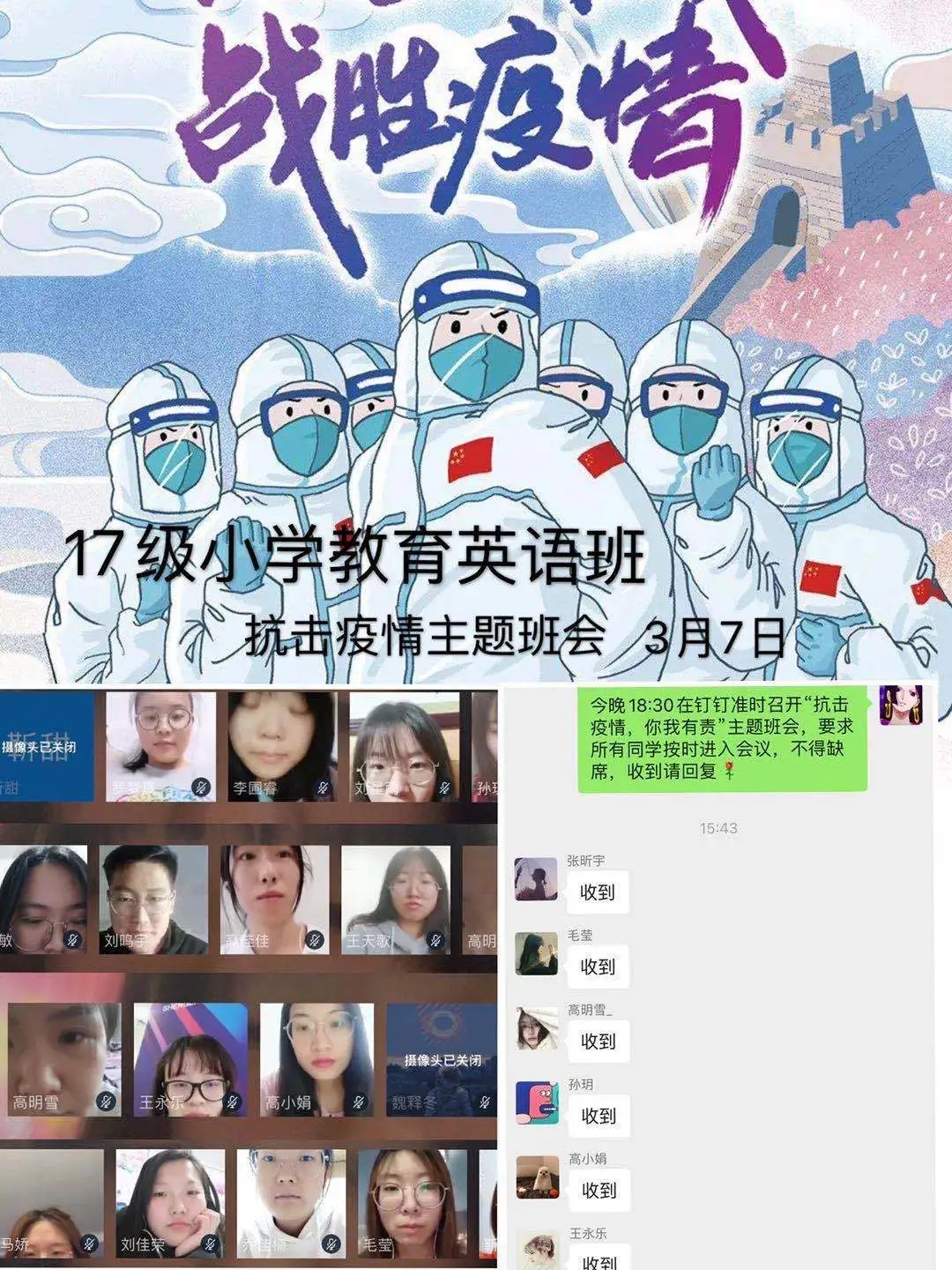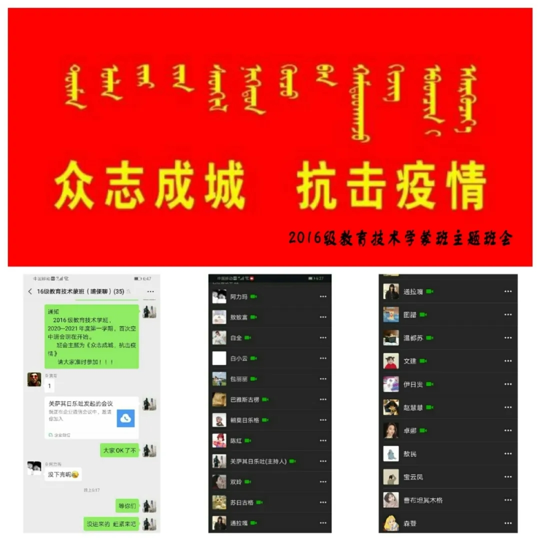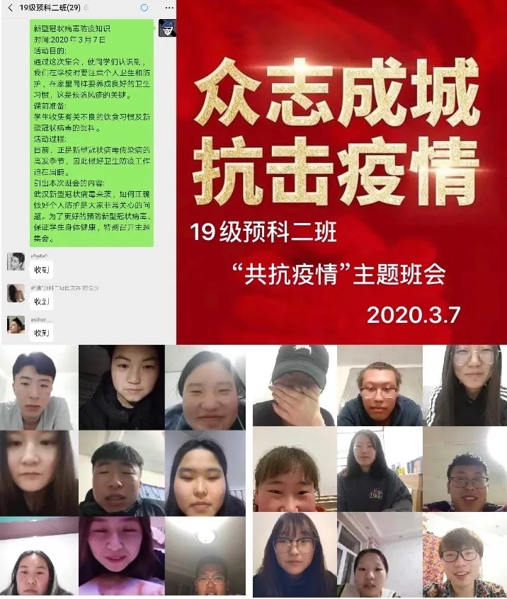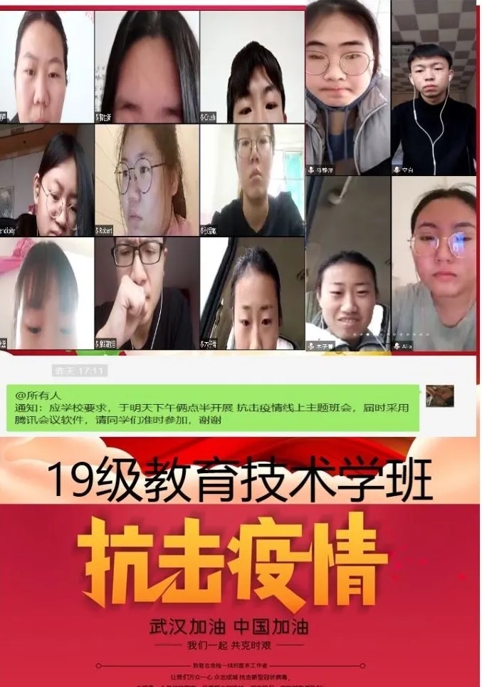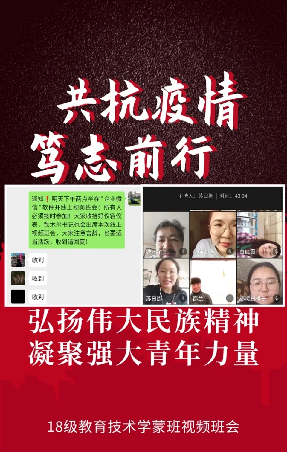 为深入贯彻落实习近平总书记关于打赢疫情防控阻击战重要指示批示精神,保障防控疫情期间停课不停学,充分发挥网络育人功能,根据自治区和学校有关工作部署,教育学院各班级组织召开共抗疫情,笃志前行为主题的疫情防控线上班会。