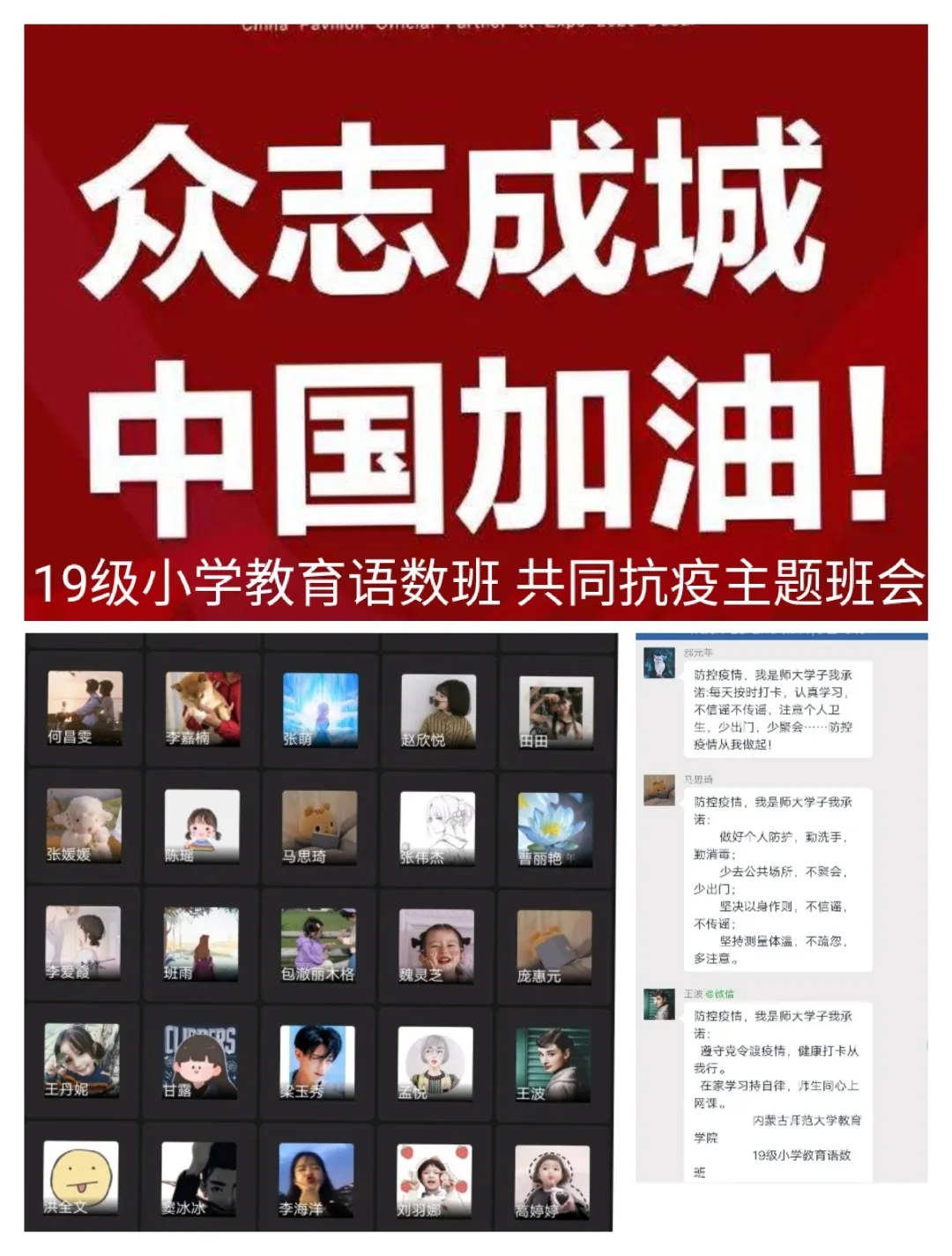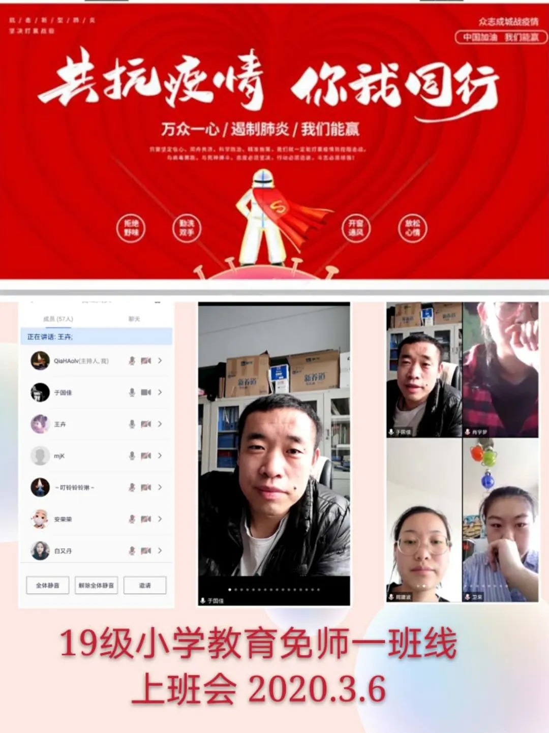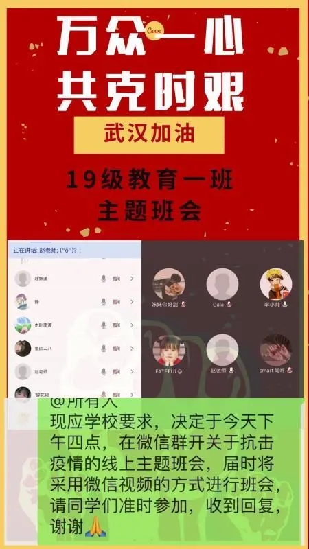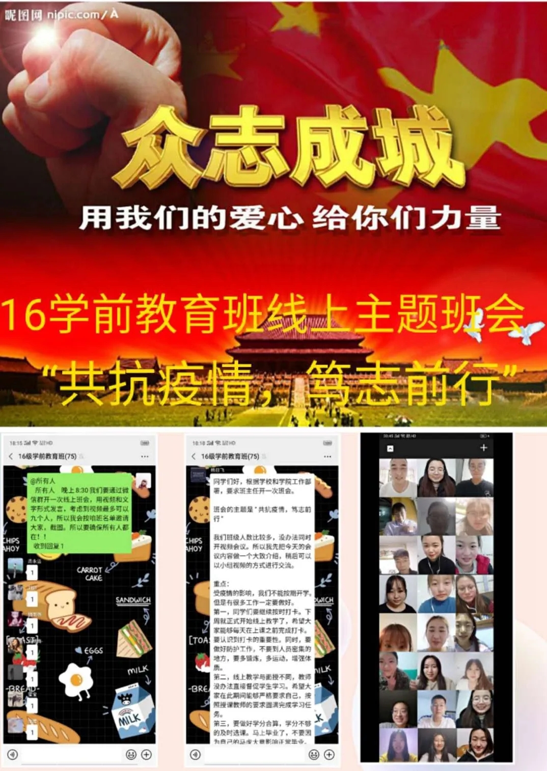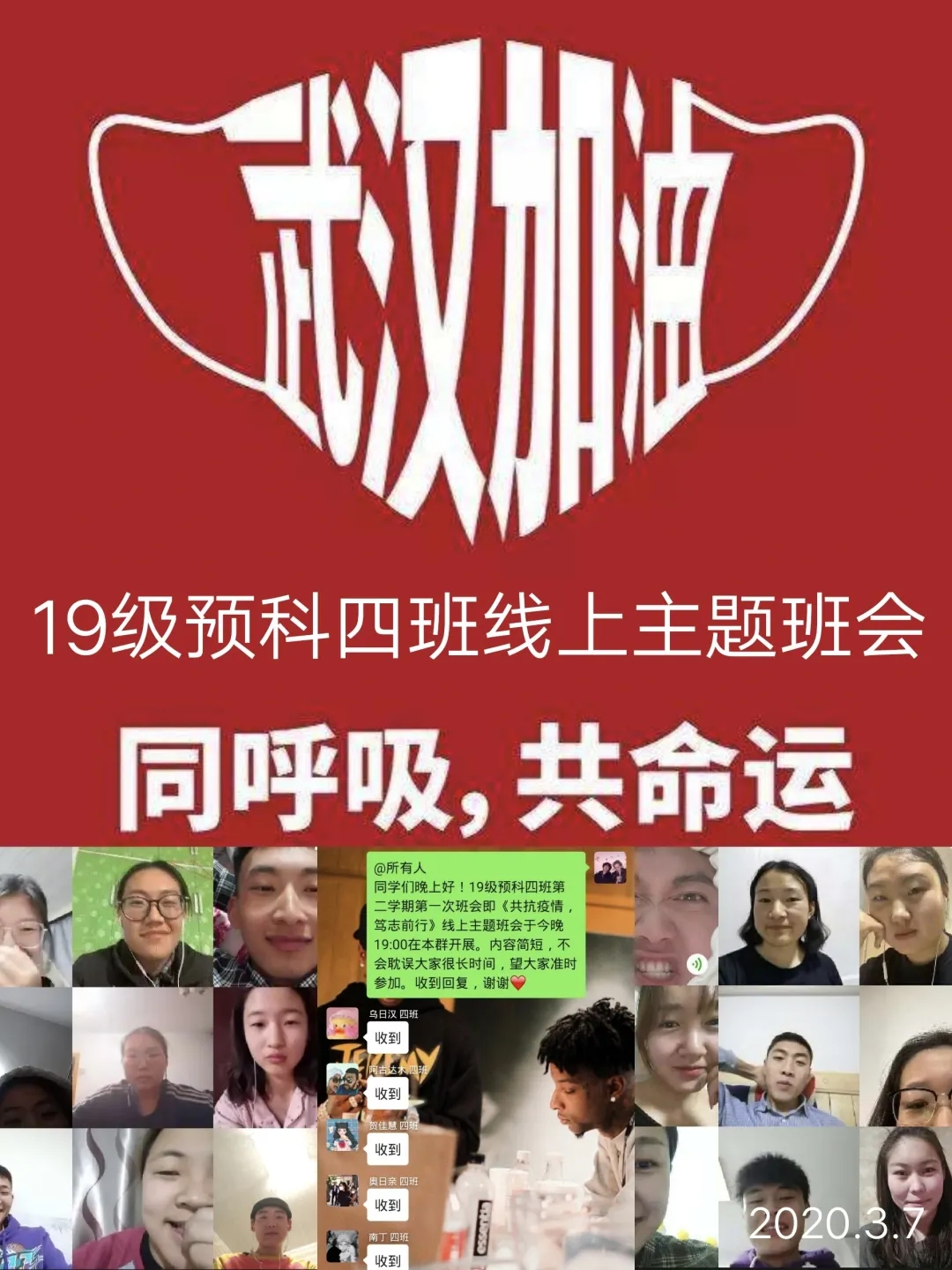 为深入贯彻落实习近平总书记关于打赢疫情防控阻击战重要指示批示精神,保障防控疫情期间停课不停学,充分发挥网络育人功能,根据自治区和学校有关工作部署,教育学院各班级组织召开共抗疫情,笃志前行为主题的疫情防控线上班会。