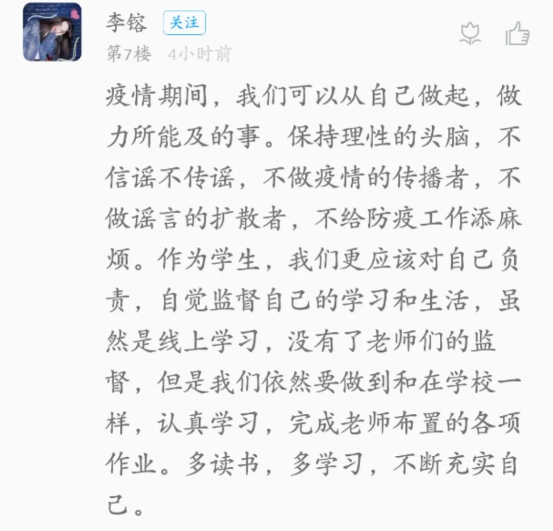 今天,我们又以特殊的方式——网上收看了黄雅丽书记的《开学第一课》。黄书记的讲话让我回想起《孟子》中的话:生于忧患,死于安乐,其实不论是国家还是个人都是一样的,作为一个国家,中国以令其他国家望其颈背的能力处理好这场攻坚战。那么身为中国人,身为中国青年的我们更应该传扬国家的精神。士不可以不弘毅,任重而道远,这是我们祖先就曾告诉我们的道理。如今当是少年破敌时,是国家需要我们的时候,也是我们自己走向未来的重要时刻。