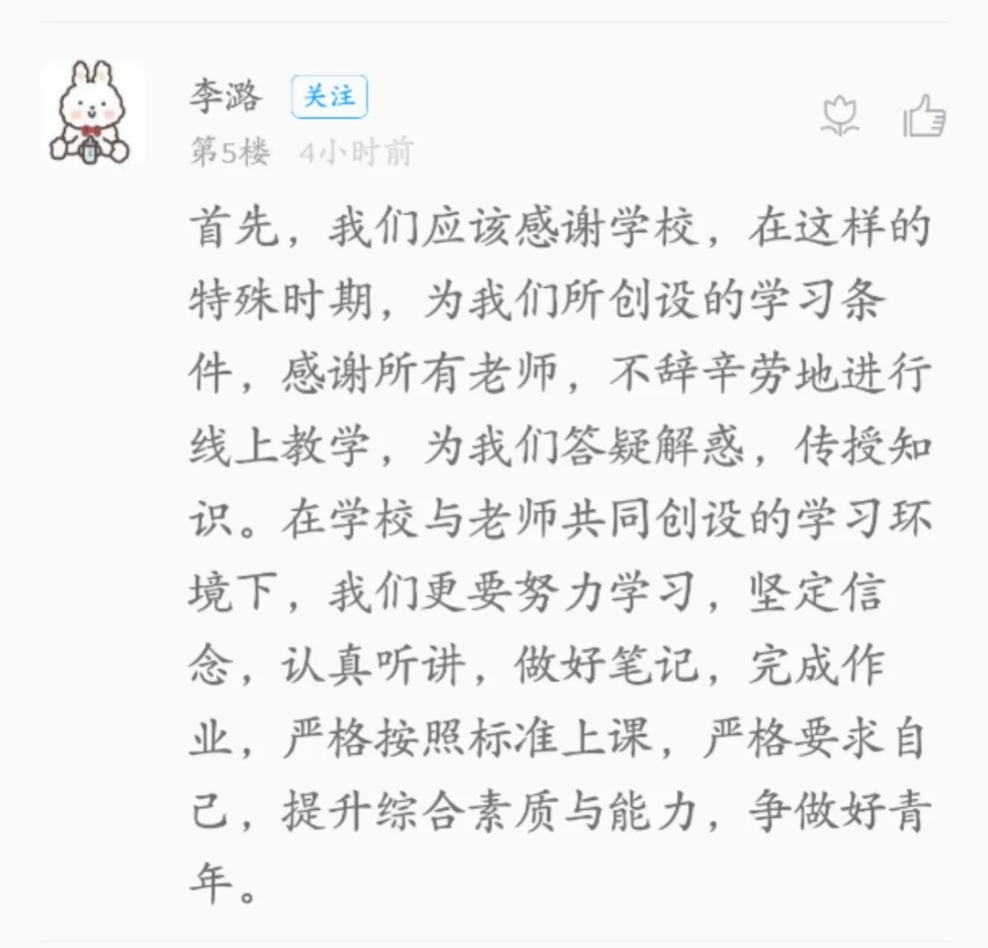 这是一次特殊的开学,一样的老师同学,不一样的开学配方,不一样的欢聚;一样的讲授互动,不一样的交流平台,不一样的火花。黄雅丽书记在讲话中以同心战疫,砥砺成长为主题,讲述了有关疫情的措施、安排,为学生的网络授课和就业实习做出指导,并对所有同学提出六个希望,让我们真切感受到学校的负责,如校训一般,真正的献身,求实,团结,奋进。正式开学后,我们会端正心态,认真对待网课,寻找到它的意义与价值;我们也会努力完成六个希望,真正做到心怀感恩、勇于担当、善于思考、心存敬畏、保持理性、体悟亲情。众志成城,共克时艰,希望疫情可以早些过去,我们可以在师大校园相约,听书声袅袅,看云卷云舒,赏春光无限,盼明日朝阳。