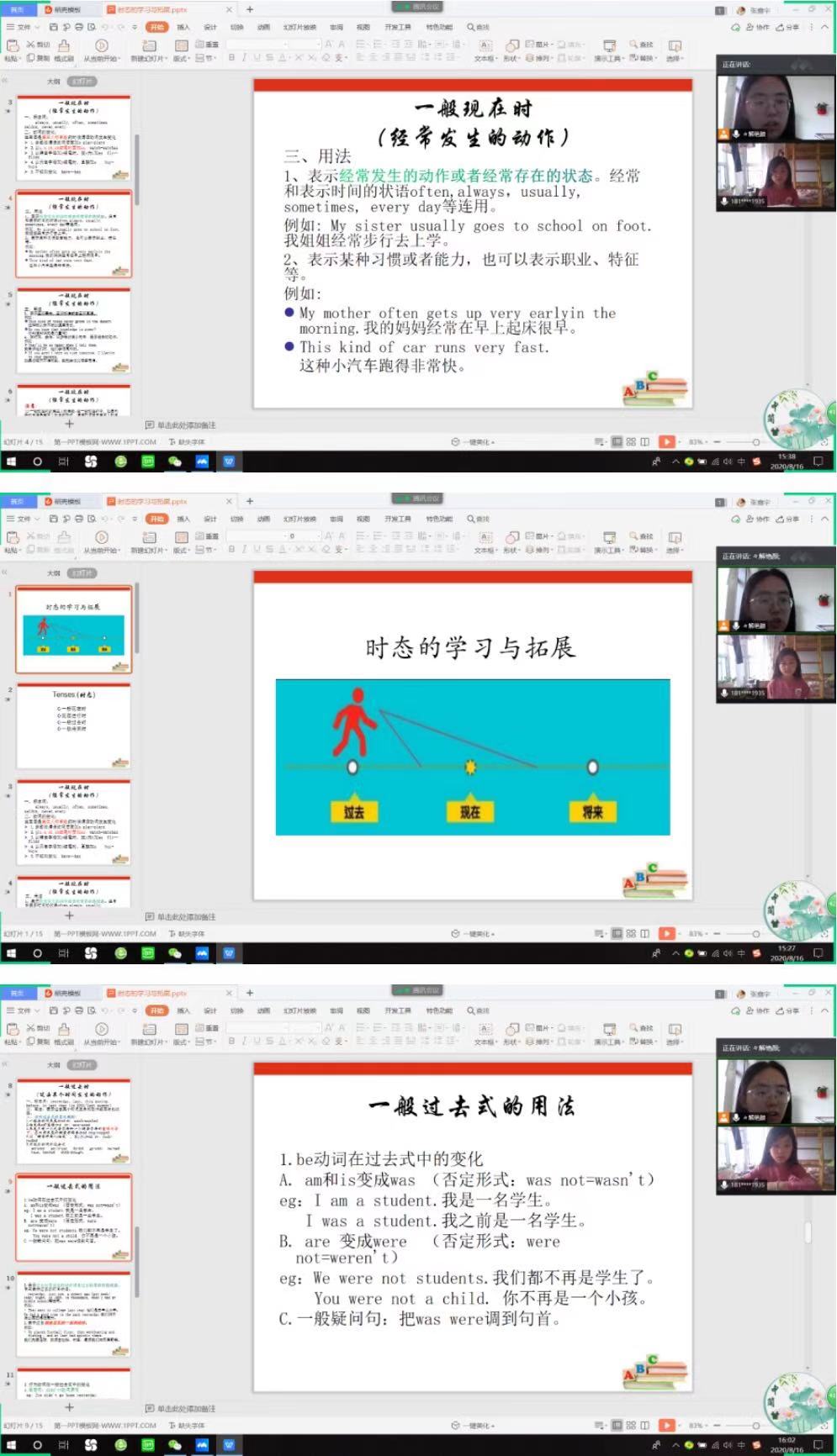 今天的新内容是英语时态,主要包括一般现在时、现在进行时、一般过去时和一般将来时。在讲解时发现廖同学对一般现在时和现在进行时的内容有比较好的把握,举例造句时问题较少,所以讲课的重点放在一般过去时和一般将来时上。一般过去时的动词变化规律同之前讲过的动词ing形式等大同小异,只是要着重把握不规律动词变化。在对于陈述句向疑问句转变时,我发现廖同学这部分知识基础较薄弱,之后的内容会着重对于句式的变化进行讲解,希望讲课的内容可以对廖同学有所帮助。