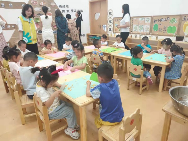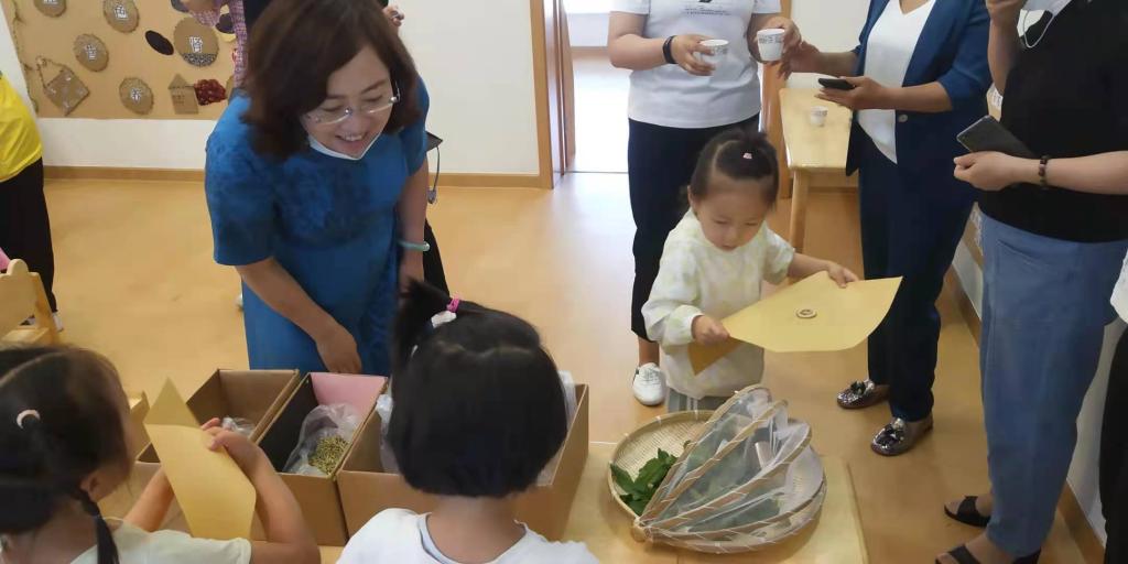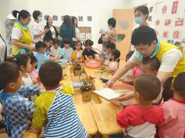 活动的第二站是老牛儿童探索馆附属幼儿园,老师们参观了幼儿园的户外活动、Remida工作坊和传统文化长廊,近距离感受了园本课程的建设与落地。在参观的过程中,老师们对“纸博物馆”的幼儿自制花草纸食育坊美味土豆饼中医馆的自制脉动、“Remida工作坊的扎染活动,以及户外体能器械锻炼、沙池寻宝、穿越黑洞等活动,进行了深入细致的观察、互动和体验。