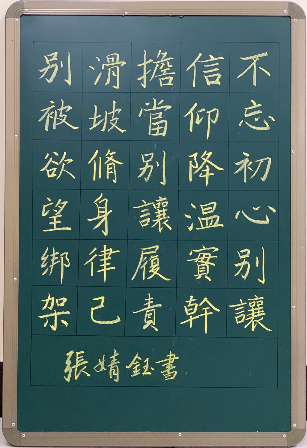 回顾四个月前,她刚一进入乌海市实验小学,就被仿古样式的教学楼与古朴的兰亭影墙吸引了。学校不愧为“中国书法兰亭小学”,校园内随处都可欣赏到师生的书法作品,语文教师更是每天严格落实一节课的写字训练。有了大学期间的写字课程、二课堂及社团活动,再加上实习学校浓厚的书法文化氛围,张婧钰同学的粉笔字、钢笔字和毛笔字都得到了巨大的提升。