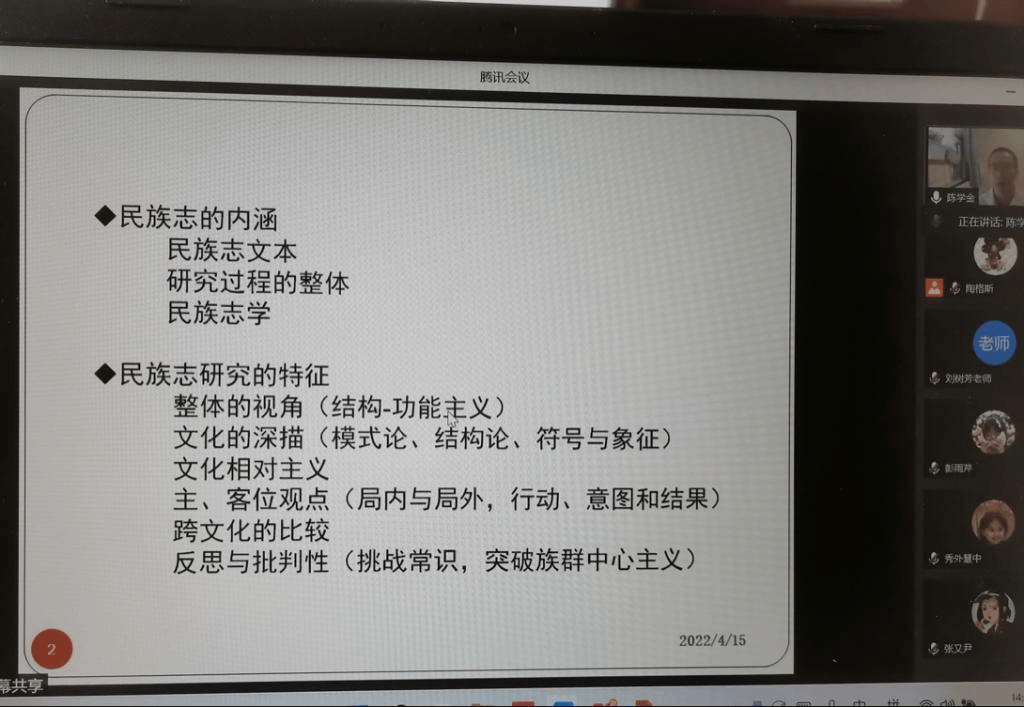 2022415日,我院邀请北京市社会科学院社会研究所副研究员陈学金博士作题为《田野工作与民族志研究导引》的学术讲座。陈学金博士对民族志的内涵、特征、不同学科民族志研究的异同、民族志和田野工作之间的关系进行探讨,在并结合三案例,围绕田野工作开展的方式方法、研究问题的凝练、文本的架构、理论的探讨与分析等多方面内容进行了深入阐述。讲座由教育学院陶格斯博士主持,本校民族教育学、课程与教学论等专业的研究生和本科生及校外师生参加。提问与交流环节中,陈学金博士推荐了人类学方法论的书籍,并分享了读书、写文章的方法与经验。