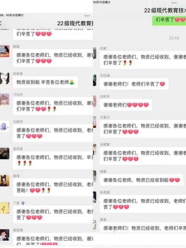2022年10月15日,在教育学院党委领导下,教育技术学教师支部组织专项活动解决学生生活急需。党员教师在了解学生目前急需的生活用品后,第一时间积极联系身边资源,确定供货和送货渠道并完成采购,随后在学校相关保障人员的配合下,经学院驻赛罕校区领导赵荣辉副院长组织志愿者送货上楼,将一批紧缺物资送到赛罕校区部分教育硕士研究生手中。这些平日里不起眼的东西,此时正是“礼轻情意重”。学生们通过微信群表达了对老师们的谢意。