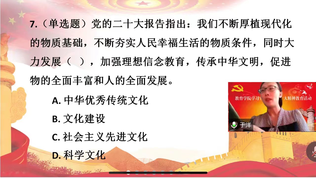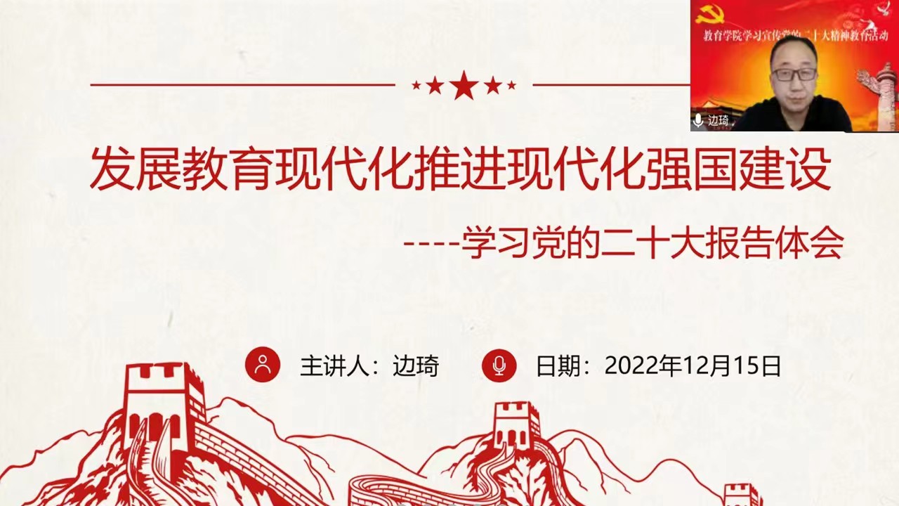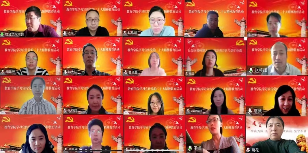 为深入贯彻学习党的二十大报告,把全院教职工的思想统一到党的二十大精神上,将教职工的力量凝聚到党的二十大确定的各项任务上,教育学院党委和工会在12月8日至12月17日举办了“学习宣传党的二十大精神教育活动”。本次活动的主题是“学习宣传贯彻党的二十大精神,凝心聚力,踔厉奋发,办好人民满意的高等教育”。受疫情影响,本次活动全程在线上进行,以“两集中、两分散”的学习方式展开。“两集中”是线上集中学习、线上集中竞答,“两分散”是居家分散学习、居家分散测试。居家分散学习、线上集中学习、线上集中竞答和居家分散测试四项活动相互融通、相互支撑,共同构成一个完整的学习单元。居家分散学习时间从12月8日起至12月14日止,期间活动筹备组定时向大家推送《党的二十大报告》全文、《中共中央关于认真学习宣传贯彻党的二十大精神的决定》等文件,并发送解读党的二十大精神的相关资料,要求教职工居家学习并深刻领会党的二十大精神。线上集中学习和集中竞答时间为12月15日下午3:00,在腾讯会议平台进行。在教育学院党委书记周越教授主持下,学院领导边琦副院长、赵荣辉副院长分别以《发展教育现代化推进现代化强国建设》、《加快建设教育强国、科技强国、人才强国》为题做了专题讲座,为教职工深入解读党的二十大精神。讲座结束后,于洋老师主持了学习宣传党的二十大精神网上集中竞答活动。会后,利用12月16日和12月17日两天时间,又通过微信小程序对全院教职工进行了居家分散测试答题活动,检验学习宣传党的二十大精神教育活动的效果。通过开展本次学习宣传党的二十大精神教育活动,教育学院全体教职工深入领会了党的二十大精神实质,为进一步贯彻落实党的二十大精神打下了坚实的思想基础。