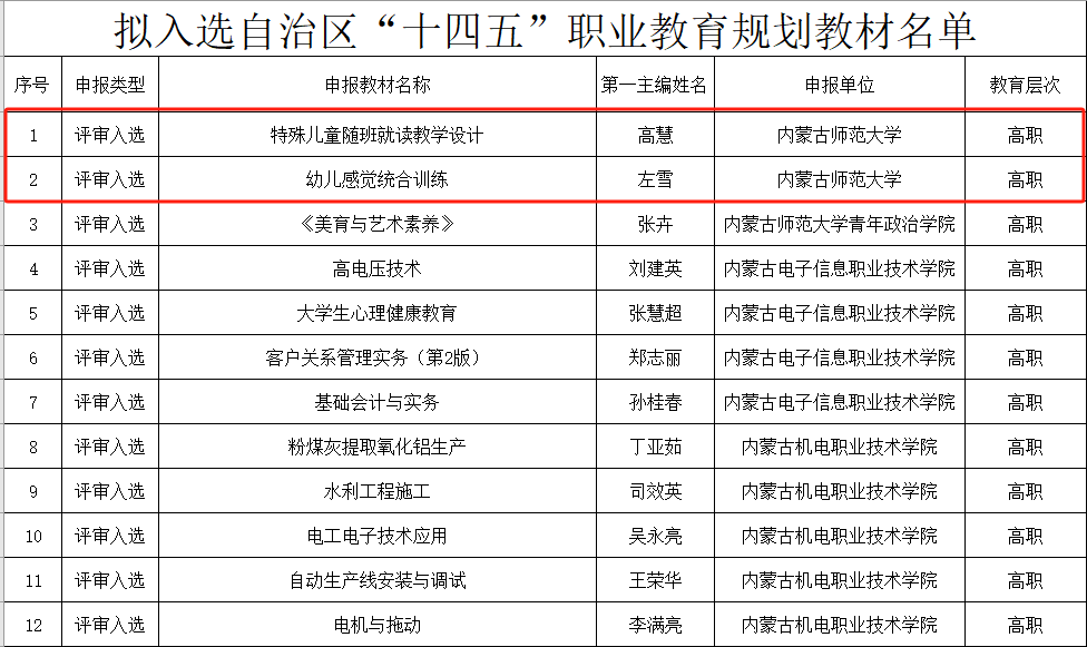 为深入贯彻党的二十大精神和全国、自治区职业教育大会精神,落实《关于深化现代职业教育体系建设改革的意见》,切实加强职业教育教材建设,内蒙古自治区教育厅开展自治区“十四五”职业教育规划教材建设工作,经过组织申报,近日公示拟入选自治区“十四五”职业教育规划教材和立项建设教材名单,我院高慧、左雪两位老师主编的《特殊儿童随班就读教学设计》《幼儿感觉统合训练》教材,入选自治区“十四五”职业教育规划教材名单。
