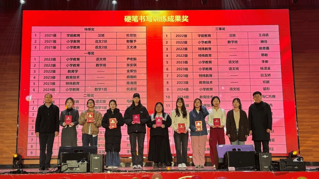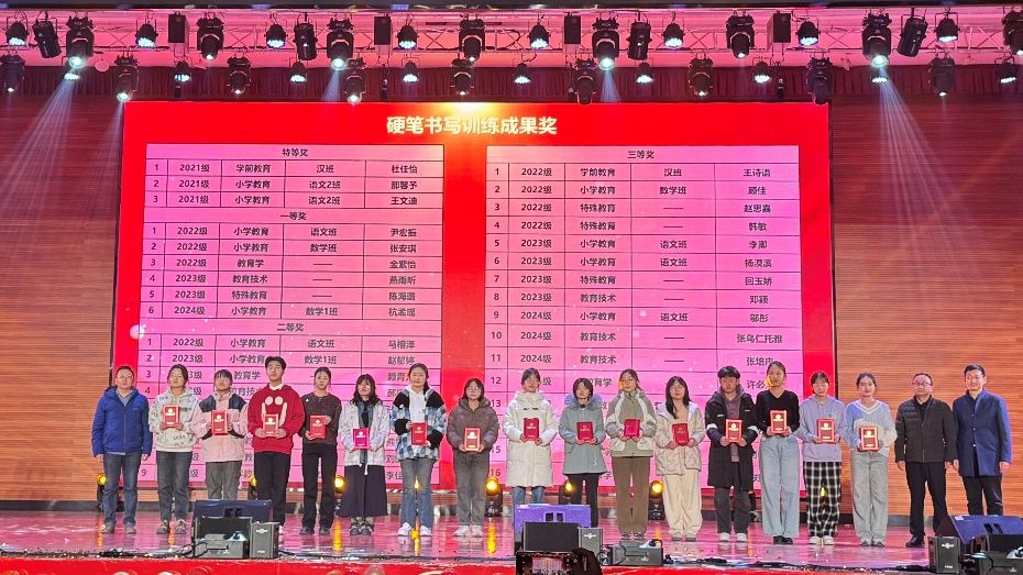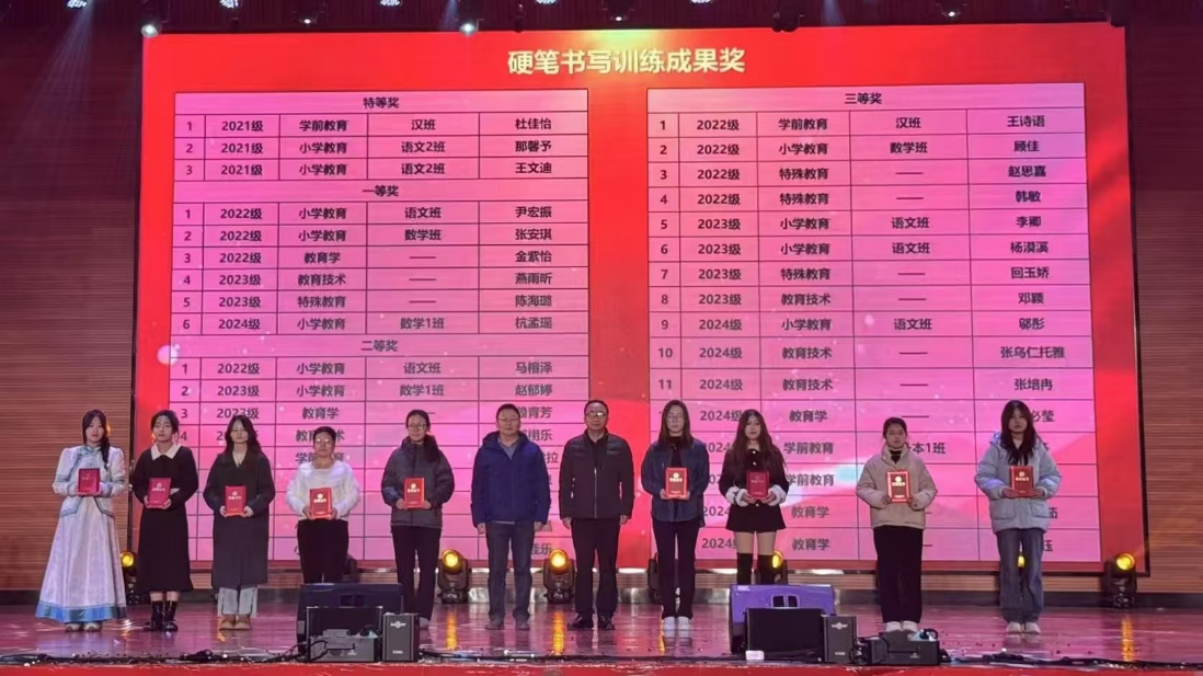 为进一步巩固书写训练效果,学院决定在11月21日举行的迎新晚会上,对本学期在书写训练中表现突出的学生进行了表彰。3名同学荣获特等奖,6名同学获一等奖,9名同学获二等奖,16名同学获三等奖。学院领导亲自为获奖学生颁发了荣誉证书。