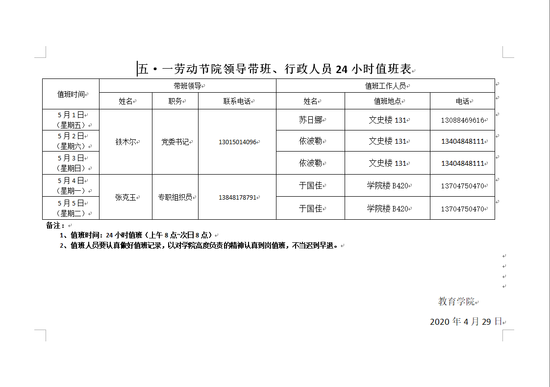 五一节值班表