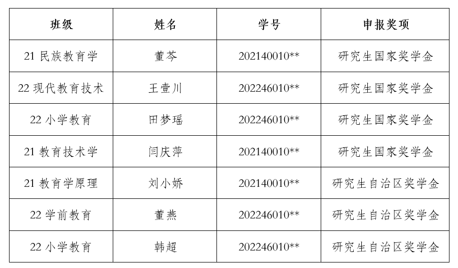依据《内蒙古师范大学研究生奖学金评选办法》(校发[2022]54号)和《关于做好2023年度研究生各类奖学金评审及材料报送工作的通知》文件精神,经过学生申请、班级推荐以及学院公开答辩,拟推荐以下学生分别申报研究生国家奖学金和研究生自治区奖学金。